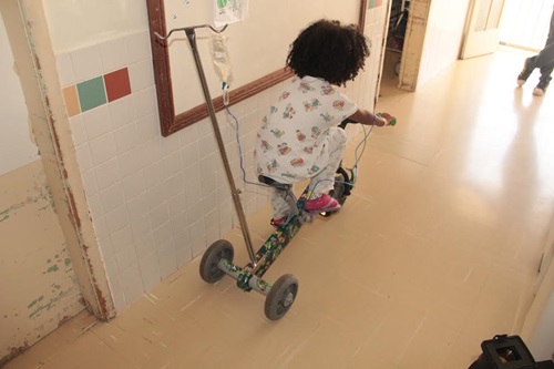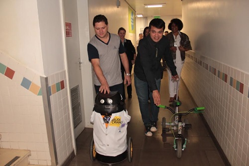 Já o triciclo feito com rodas de macas e suporte de soro, concebido em parceria com estudantes da Escola Técnica José César de Mesquita (Zona Norte), com base no projeto de conclusão do curso de mestrado do fisioterapeuta da UTI Pediátrica Diego Kurtz, motivou os olhares nos corredores da enfermaria. O novo brinquedo chamou atenção dos profissionais de saúde, dos pais e dos coleguinhas de quarto, quando uma pequena de cabelos cacheados passou pedalando pelos corredores.