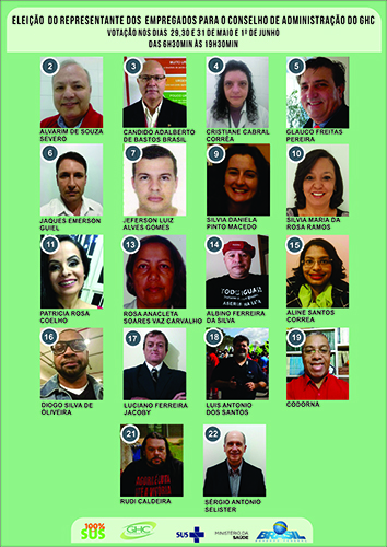 A Comissão Eleitoral divulgou nesta segunda-feira, 15 de maio, a relação dos candidatos com candidatura homologada para Representante dos Empregados no Conselho de Administração do Grupo Hospitalar Conceição para o biênio 2017/2019.