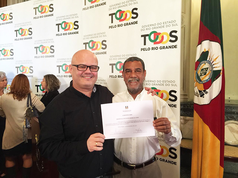 A Comissão Intra-Hospitalar de Doação de Órgãos e Tecidos para Transplante do Hospital Cristo Redentor (Cihdott/HCR) recebeu nessa segunda-feira, 25 de setembro, o certificado de Incentivador da Vida, honraria concedida pelo Governo do Estado, por meio da Secretaria Estadual da Saúde, a instituições que se destacam na área de captação de órgãos e transplantes. O certificado foi entregue pelo governador José Ivo Sartori e pelo secretário estadual da Saúde, João Gabbardo dos Reis, ao membro da Cihdott/HCR Manoel Nelson, que representou o Hospital Cristo Redentor na cerimônia. Também esteve presente o coordenador da Cihdott/GHC, José Luís Toríbio Cuadra.