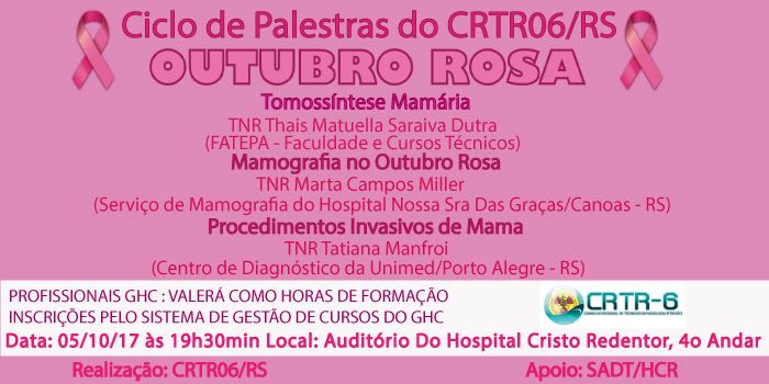 Será realizado no dia 5 de outubro, às 19h30 minutos, no Auditório do Hospital Cristo Redentor, o ciclo de palestras promovido pelo Conselho Regional de Técnicos em Radiologia do Rio Grande Sul (CRTR06), com o tema “Outubro Rosa".