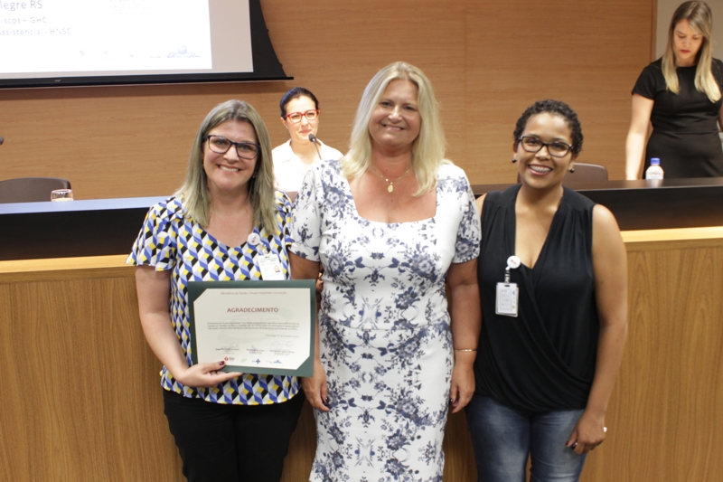 A diretora-superintendente, Adriana Denise Acker parabenizou todas as equipes que estiveram envolvidas no projeto e destacou que é importante reconhecer os profissionais quando o trabalho é bem feito. "É importante para nós da diretoria estar reconhecendo os trabalhos realizados, a gente aprendeu que cada singela homenagem tem um significado muito grande para aqueles que trabalham aqui". Durante a sua fala, ela entregou o certificado para três equipes envolvidas no projeto: a equipe de Gestão Assistencial do HNSC, a Coordenação de Enfermagem do HNSC e a equipe da Gestão de Riscos do GHC.