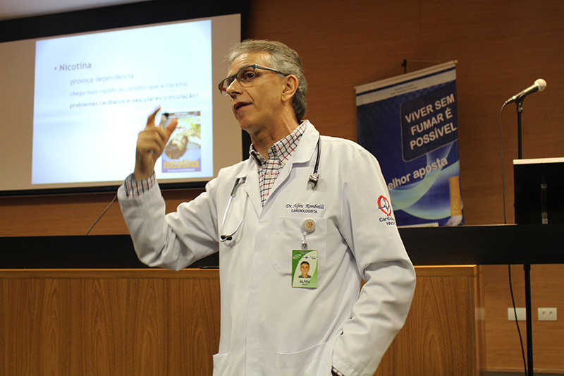 O médico cardiologista do HNSC Alfeu Roberto Rombaldi usou uma linguagem informal de modo descontraído para trazer dados sobre o tabagismo e doenças cardíacas. As doenças cardiovasculares são a principal causa de mortalidade em todo o mundo. O uso do tabaco e a exposição passiva ao fumo contribuem para 12% de todas as mortes por doenças cardíacas. O médico apontou que, na faixa de homens com menos de 65 anos, estão 45% das mortes por doença coronariana, enquanto 40% das mulheres com mais de 65 anos têm morte por doença coronariana. Ainda segundo o cardiologista, homens fumantes entre 45 e 54 anos têm três vezes mais chances de morrer por infarto do miocárdio.