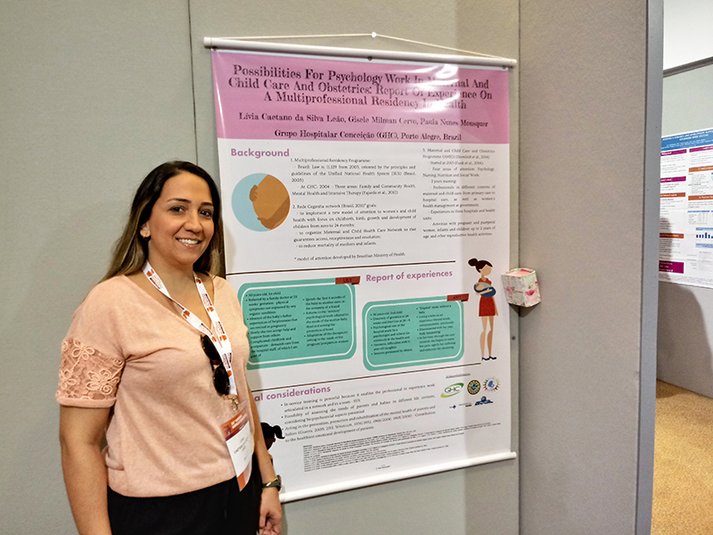Lívia Caetano da Silva Leão, psicóloga residente do programa Atenção Materno-Infantil e Obstetrícia da Residência Multiprofissional do Grupo Hospitalar Conceição, apresentou dois trabalhos no 16th World Association for Infant Mental Health World Congress - New challenges for a 3rd Millenium Infant Mental Health, realizado em Roma, Itália, de 26 a 30 de maio. O pôster intitulado “Possibilities for Psychology Work in Maternal and Child Care and Obstetrics: Report of Experience on a Multiprofessional Residency in Health” teve a colaboração das psicólogas do GHC Paula Nunes Mousquer e Gisele Milman Cervo.