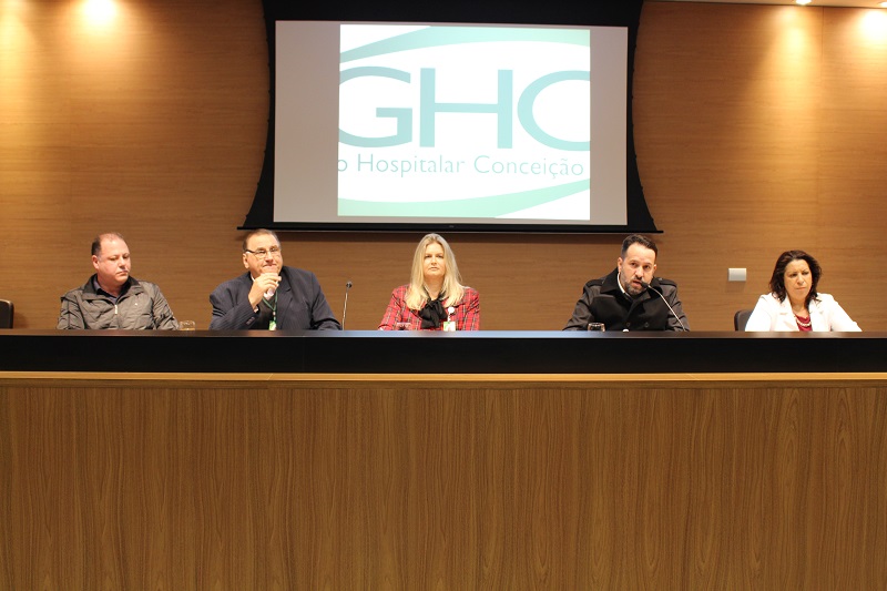 A abertura do evento contou com as presenças da diretora-superintendente do GHC Adriana Denise Acker, do diretor técnico, Mauro Sparta, do diretor administrativo e financeiro, José Ricardo Agliardi Silveira, do gerente de Apoio do Hospital Conceição, Sandro Franciscatto, e da coordenadora do Centro de Resultados Participação Cidadã, Rosângela Vianna Bellos.