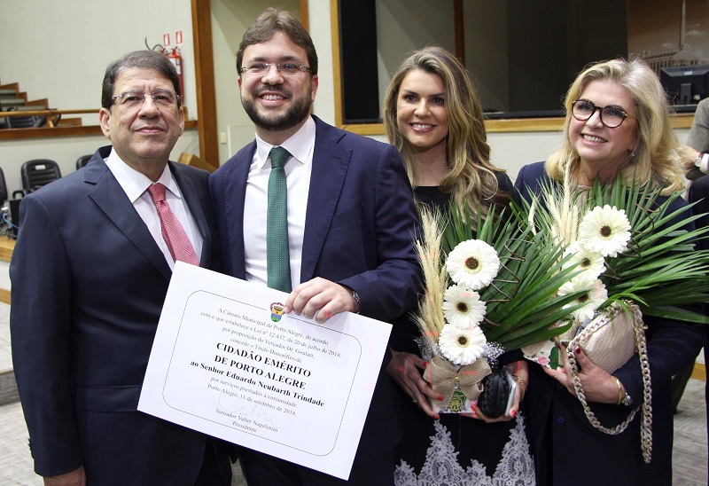 Foi entregue na noite dessa terça-feira, 11 de setembro, o título de Cidadão Emérito de Porto Alegre ao gerente de Internação do Hospital Fêmina, Eduardo Neubarth Trindade. A honraria, uma das principais da Câmara de Vereadores do município, é concedida a pessoas que se destacam no ramo do saber humano ou que, por sua ação, se tornam merecedoras de reconhecimento da cidade. Trindade foi agraciado por sua atuação na saúde, especialmente em prol do Sistema Único de Saúde (SUS). Na ocasião, ele disse que o título reforça seu compromisso como cidadão e profissional. “É com muita honra e satisfação que recebo esse título. Me sinto no compromisso de ter uma conduta ilibada, pautada pela ética, no percurso de minha vida”, afirmou.