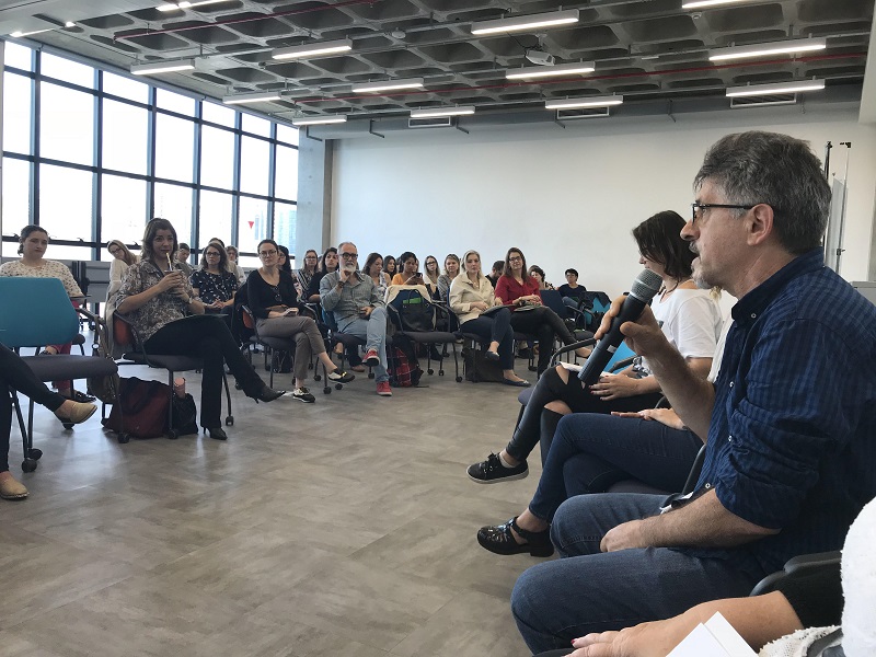 Logo em seguida, as convidadas Vera Pasini (UFRGS) e Daniela Dallegrave (UFGO) proferiram palestra sobre a história, o atual momento das Residências em Saúde e perspectivas futuras. À tarde, o trabalho foi desenvolvido em pequenos grupos. Estes foram coordenados por facilitadores da comissão organizadora, que receberam treinamento para a função com a terapeuta ocupacional do GHC, Marta Orofino, que preparou o grupo para desenvolver o trabalho de modo a fomentar as discussões nos pequenos grupos sobre os temas referentes ao cotidiano e processos de trabalho de preceptores e tutores. No fim do dia, realizou-se a plenária final, com o compartilhamento das produções dos grupos e encaminhamentos.