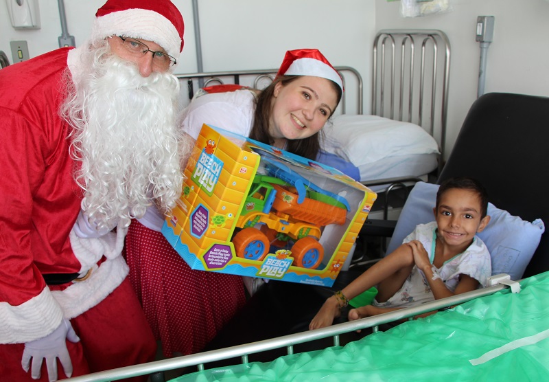 Época de Natal costuma ser de alegria para os pequenos, e mais uma vez as crianças presentes no ambulatório e internação da Onco-Hematologia do Hospital Criança Conceição (HCC) ganharam presentes e muito carinho na manhã desta quarta-feira, 19 de dezembro. A ação foi promovida pelos voluntários Vinicius Giordani, vestido de Papai Noel e suas ajudantes Lis Barreto e Paula Campos.