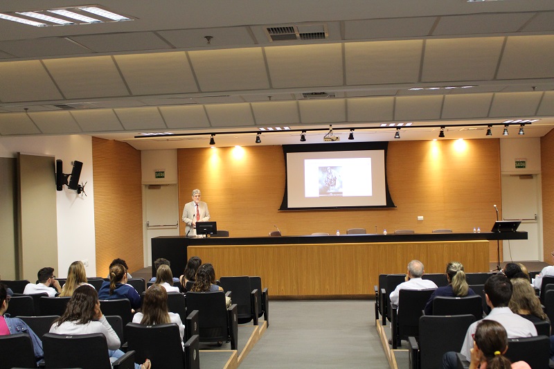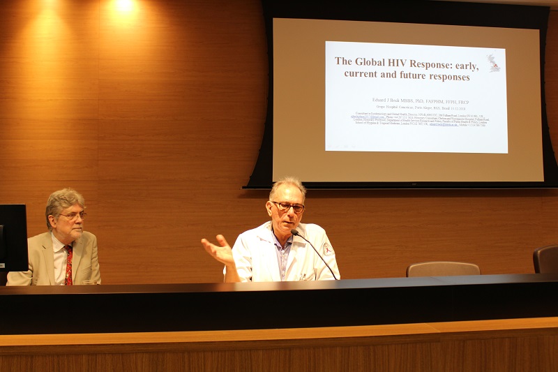 Foi realizada na quarta-feira, 19 de dezembro, no auditório Jahyr Boeira de Almeida do Centro Administrativo do Grupo Hospitalar Conceição a palestra The Global HIV Response: Early, Current and Future Responses apresentada pelo médico epidemiologista inglês Eduard J. Beck. Promovido pelo Serviço de Infectologia do Hospital Conceição (HNSC), o evento foi coordenado pelo chefe do Serviço de Infectologia do HNSC, Breno Riegel Santos que abriu o encontro expressando alegria pelo privilégio em contar com a participação de Beck. A palestra foi alusiva ao Dezembro Vermelho, mês de conscientização para prevenção a AIDS.