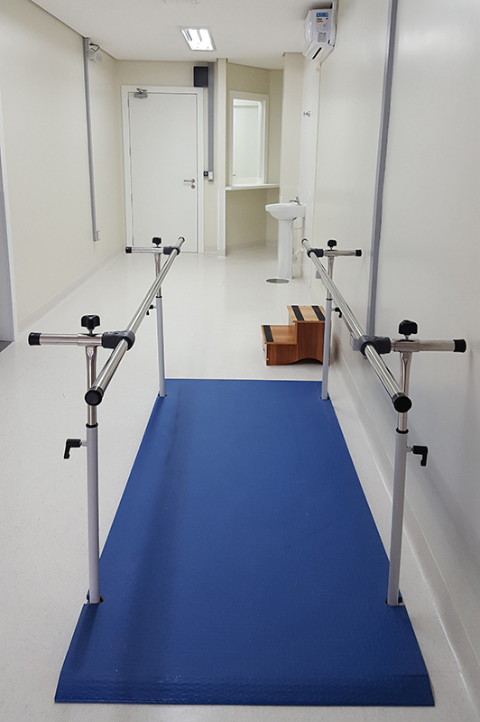 O local conta com equipamentos como tatames, esteira, suporte de peso, estação de musculação, barra paralela, bolas com suporte, muletas, andadores, entre outros.