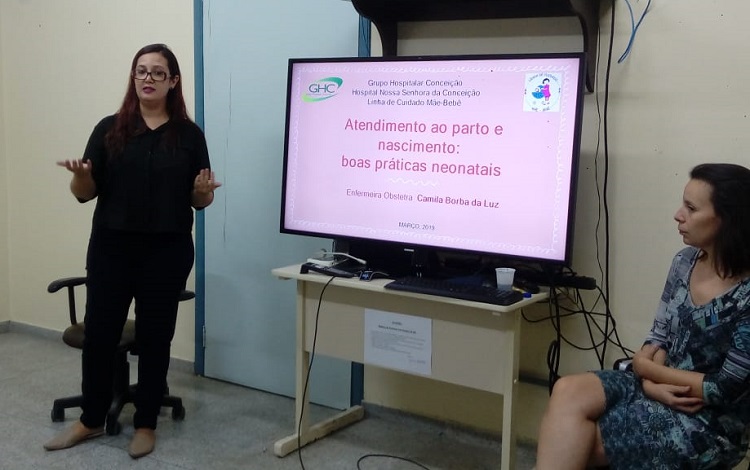 Foram abordados os seguintes temas: modelo colaborativo de assistência ao parto, métodos não farmacológicos de alívio da dor, assistência ao recém-nascido, contato pele a pele, clampeamento oportuno do cordão e amamentação na primeira hora de vida. Ao final do encontro, os profissionais de saúde da região demonstraram interesse em ampliar as trocas de experiências com o Hospital Conceição.
