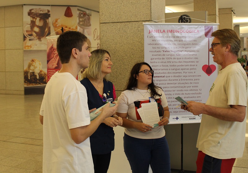 No estande, dois bânneres com informações sobre a doação, além de profissionais prestando esclarecimentos específicos e distribuindo fôlderes com informações sobre o funcionamento do Banco de Sangue do GHC. Além da coordenadora Andrea, participam da ação a estagiária Mariana Schimidt e o fisioterapeuta residente do Programa de Gestão em Saúde da Residência Multiprofissional em Saúde do GHC Eduardo dos Santos Cardoso, que se engajou na causa.