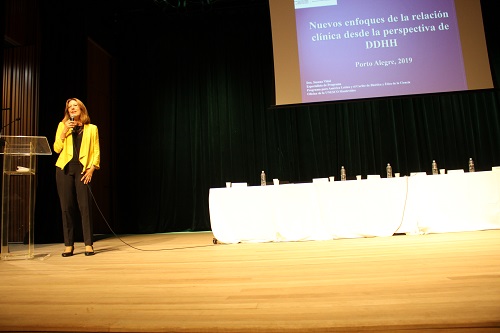 Em sua fala, o diretor técnico do GHC, Francisco Zancan Paz, reforçou o compromisso da atual gestão com o Comitê de Bioética do GHC. “Gostaria de cumprimentar a equipe organizadora deste evento, na pessoa do Dr. Amoretti, batalhador, incansável pela causa, e garantir que a atual direção do GHC está trazendo total apoio às atividades do comitê, pois entendemos ser de suma importância no desenvolvimento das ações de um grupo que é público, 100% SUS e que tem como missão melhor atender à população”, pontuou Paz. Em seguida, Suzana Maria Vidal realizou a conferência Novos Enfoques na Relação Clínica sob a perspectiva dos Direitos Humanos.