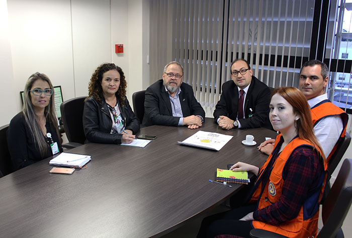 Participaram também da reunião a gerente de Administração do Hospital Conceição, Marina Machado Dias, e a representante da Assessoria de Comunicação Social da Defesa Civil Camila dos Santos.