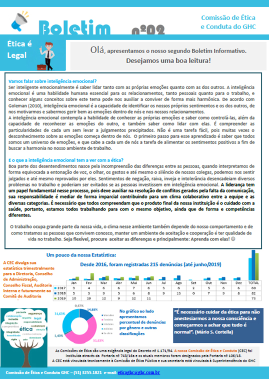 Dando continuidade ao Plano de Trabalho da Comissão de Ética e Conduta do Grupo Hospitalar Conceição, foi realizado na tarde da última quarta-feira, 31 de julho, o segundo curso presencial de Ética e Conduta no Auditório do Hospital Fêmina. Essa é uma importante atividade para a disseminação da cultura ética na instituição, que visa capacitar os funcionários sobre noções conceituais em ética, comportamentos esperados e vedados do Código de Ética e Conduta do GHC, Comissão de Ética e Conduta do GHC e seus normativos, Comissão de Ética Pública, rito processual da Comissão de Ética e Conduta, canais de denúncias e sanções.