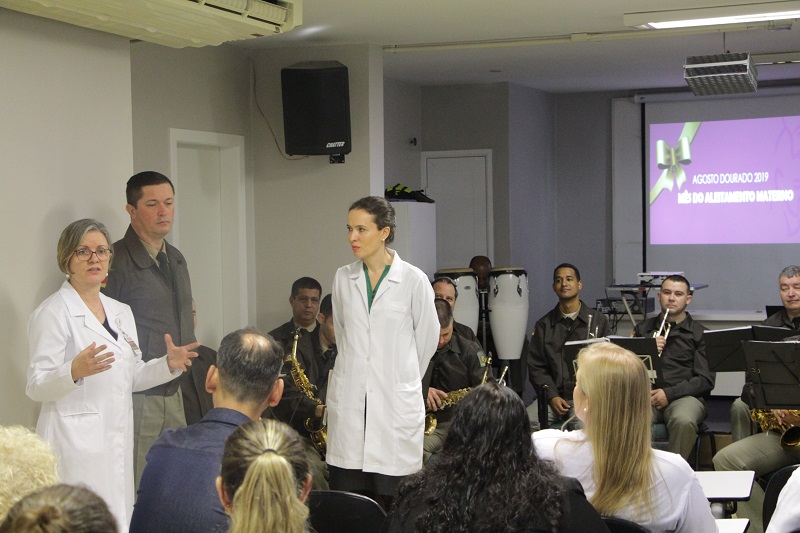 A médica responsável pelo Banco de Leite Humano do HF, Cristina Simon, ao abrir o encontro, agradeceu as presenças e parceria da Banda do Comando Regional da Brigada Militar do Vale do Rio dos Sinos. O encontro foi alusivo ao Agosto Dourado, mês dedicado à intensificação das ações de promoção, proteção e apoio ao aleitamento materno. Em 2019, o foco da Sociedade Brasileira de Pediatria está na reflexão junto aos pediatras do país a fim de estimular o protagonismo dos profissionais junto as famílias incentivando além das mães, aos pais a participarem desde o pré-natal, conhecendo os detalhes da importância da amamentação.