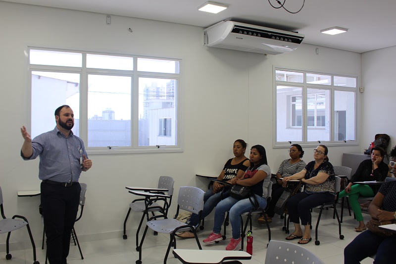 O oncologista clínico do GHC Gustavo Vasconcelos Alves ministrou a primeira aula do curso. O plano de ensino tratará, entre outros temas, a epidemiologia do câncer e conceitos introdutórios sobre fisiopatologia, os cuidados de enfermagem com o paciente oncológico, a segurança do paciente e a segurança do profissional da saúde.