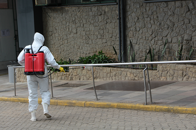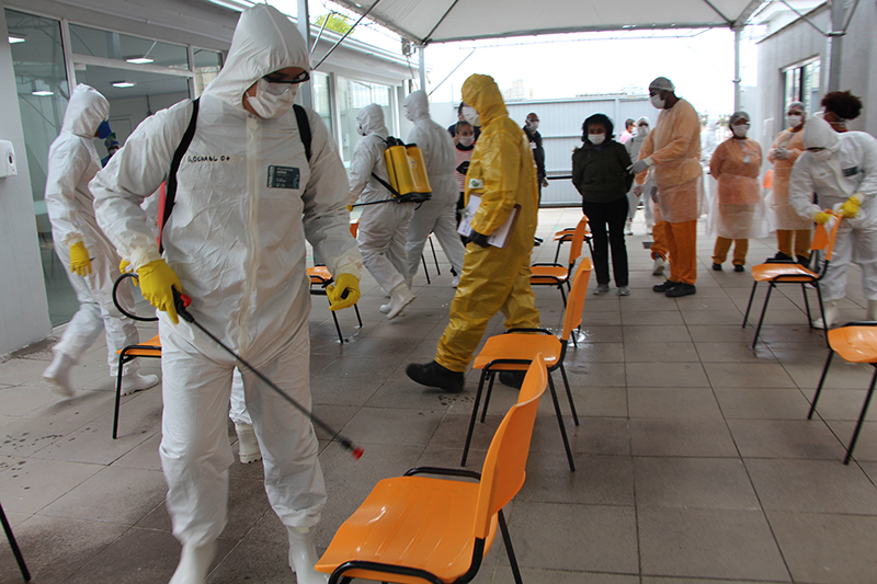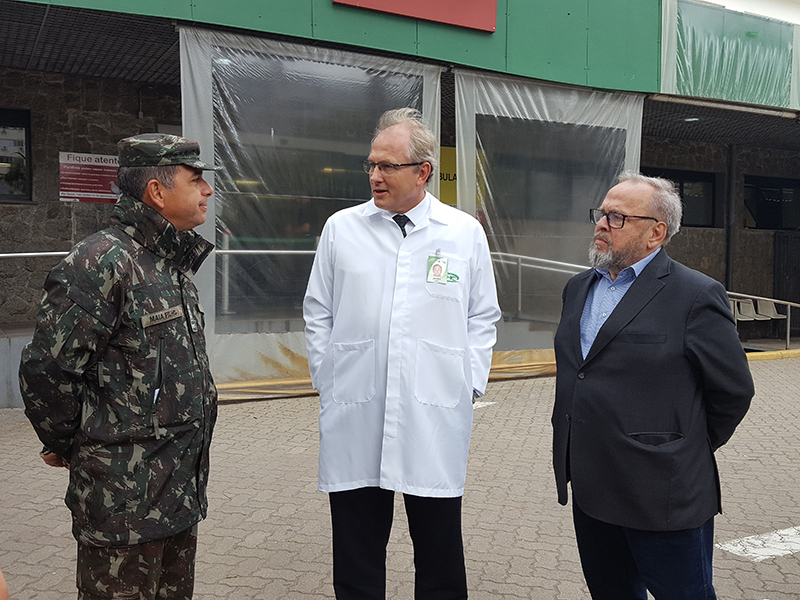 Nessa quinta-feira, 16 de abril, militares da Marinha, Exército, Aeronáutica e Polícia Rodoviária Federal realizaram uma desinfecção com ação bactericida na área do Centro de Triagem Covid-19 do Grupo Hospitalar Conceição (GHC) e em frente ao Hospital Conceição. A operação, que tem como objetivo prevenir a contaminação pelo novo coronavírus, é realizada por meio da Defesa Civil.