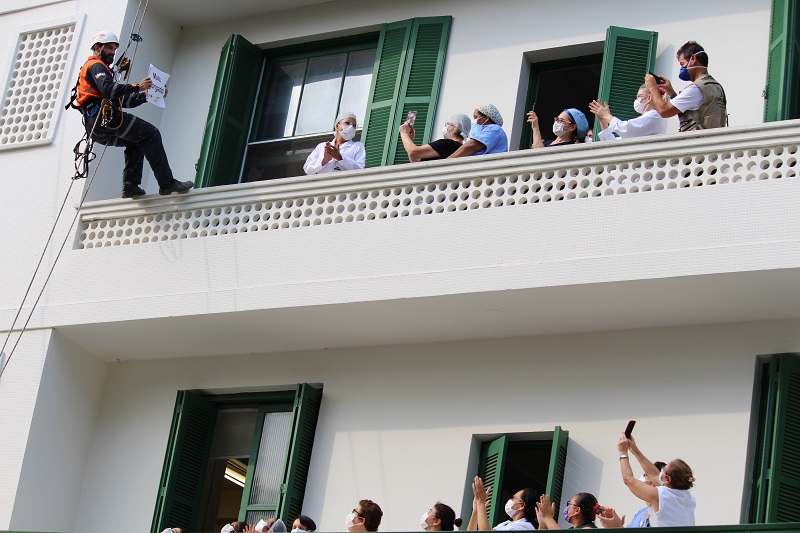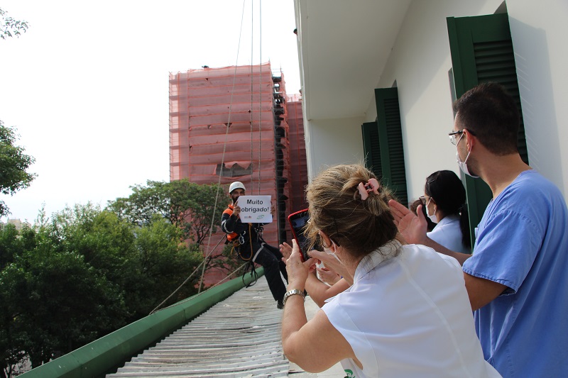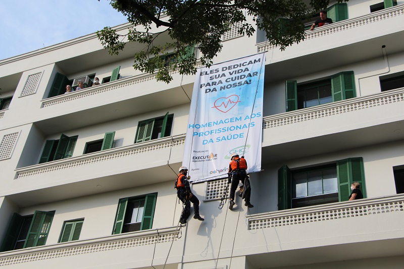 Uma ação voluntária de alpinistas da empresa Executar mobilizou os funcionários do Hospital Conceição na tarde dessa quarta-feira, 29 de abril. Com o objetivo de homenagear os profissionais da saúde, os alpinistas desceram de rapel o prédio do hospital com mensagens de agradecimento. Num primeiro momento, eles exibiram cartaz com o “Muito obrigado” para os profissionais das enfermarias. Na sequência, fixaram um grande banner na entrada dos funcionários, também com homenagem, ao som de aplausos do público presente.