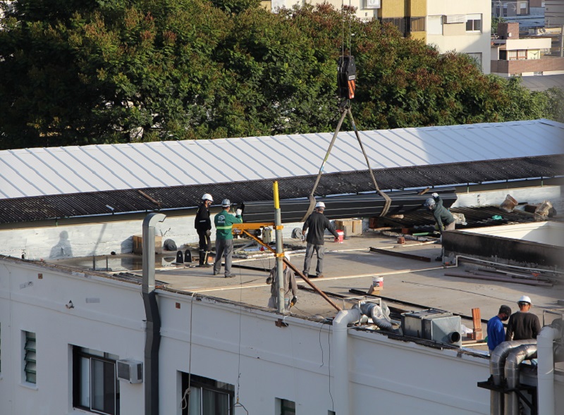 Posteriormente, as obras, que beneficiam as áreas assistenciais e de apoio do HNSC, serão realizadas também no Bloco A, Bloco B, Capela, Bloco E (parcial) e Bloco F. O serviço contempla a substituição de calhas, algerosas, condutores verticais e telhas, além da impermeabilização de lajes. A estrutura de cada telhado está sendo executada em estrutura metálica substituindo as de madeira existentes.