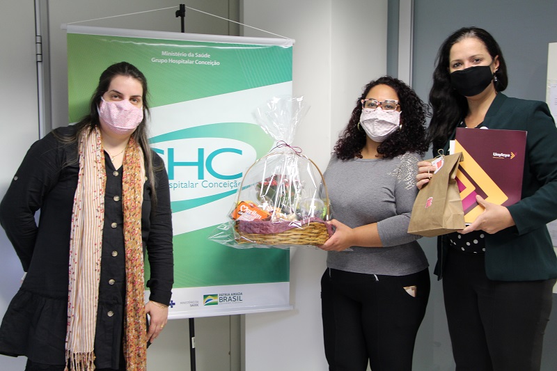 Nesta sexta-feira, 19 de junho, o Grupo Hospitalar Conceição (GHC) recebeu a representante da Faculdade Unyleya Andressa Oliveira. A instituição, que é de Portugal e atua há 11 anos no Brasil, preparou um sorteio especial para os enfermeiros e técnicos de enfermagem do GHC que estão trabalhando no combate ao coronavírus. Assim, a visita teve como objetivo entregar uma cesta, recheada de mimos, para a técnica de enfermagem do Instituto da Criança com Diabetes Juliana Rodrigues da Silva, que foi a ganhadora do sorteio.