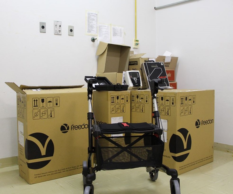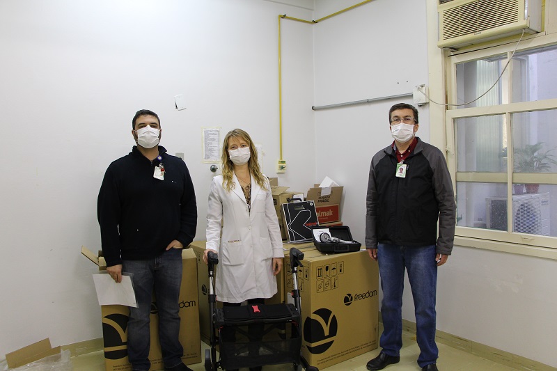 Foram entregues seis andadores com freio e cadeira, um aparelho de ventilação não invasiva (BIPAP), que ajuda na respiração do paciente, um dinamômetro, que serve para avaliação muscular, e seis balanças, que serão utilizadas nas unidades de internação Covid. Os equipamentos serão disponibilizados em breve para uso.