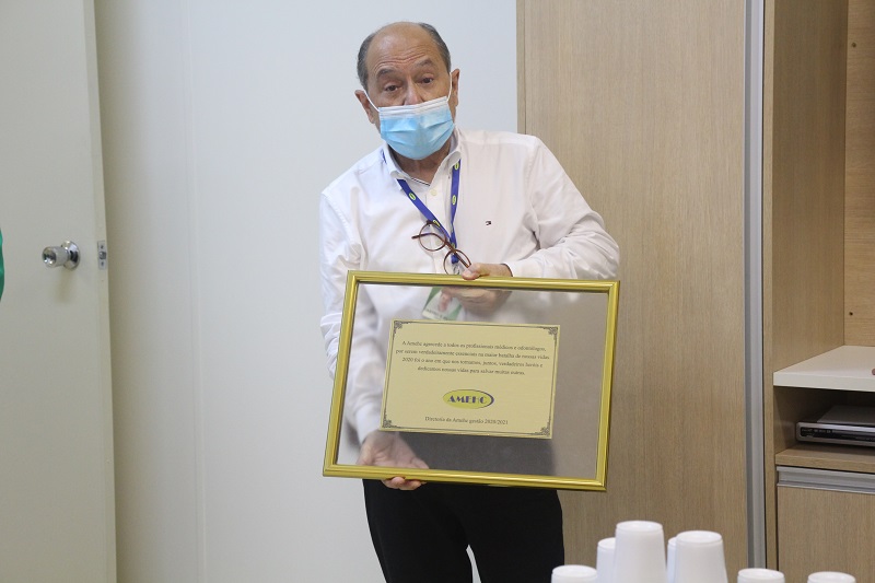Nessa segunda-feira, 19 de outubro, o fundador da Residência em Ginecologia e Obstetrícia, Paulo Agostinho Damiani, falecido em 28 de agosto, foi homenageado pela Associação de Médicos e Odontólogos dos Hospitais Conceição e Criança Conceição (Amehc). Uma placa de agradecimento pelos serviços prestados ao Hospital Conceição durante os 35 anos em que atuou na instituição foi entregue à esposa dele, a ginecologista Annie Consuelo Damiani. A associação também homenageou, com uma placa, os médicos e odontólogos que atuam durante a pandemia da Covid-19, em alusão ao Dia do Médico comemorado no último domingo, 18 de outubro.