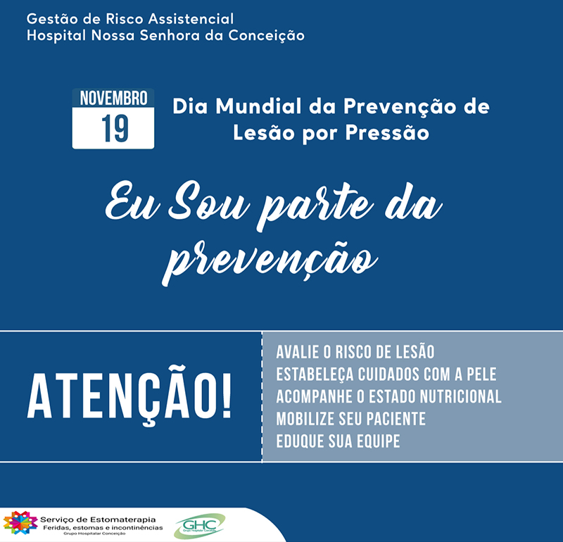 Em 19 de novembro, é comemorado o Dia Mundial de Prevenção de Lesão por Pressão (LP), que, neste ano, traz em sua campanha o tema “LP: eu sou parte da prevenção”. Em alusão à data, o Serviço de Estomaterapia do Hospital Conceição promove, no dia 19, às 14h, no Facebook do Grupo Hospitalar Conceição, uma live informativa.