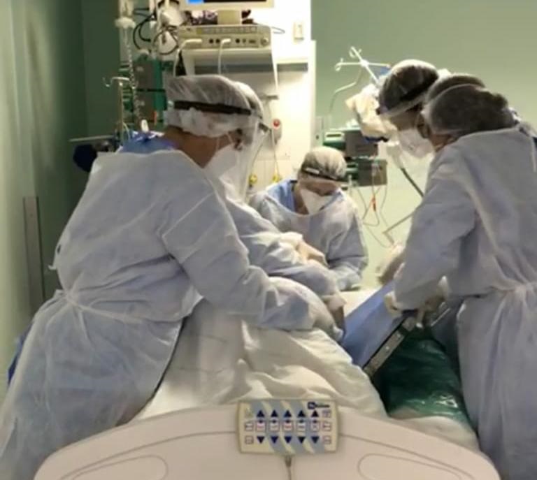 Com a chegada do novo coronavírus, profissionais de saúde estão se reinventando no enfrentamento da pandemia, procurando as melhores formas de atender os pacientes e de facilitar seus trabalhos. Na UTI Covid-19 do Hospital Nossa Senhora Conceição (HNSC), por exemplo, os profissionais encontraram uma nova função para o roller (uma espécie de prancha forrada com uma lona e montada em cima de rolamentos), que é utilizado na transferência de pacientes das macas para os leitos, principalmente, de UTIs. O equipamento, também chamado de lona de transferência, faz parte da técnica de pronação desde novembro de 2020.