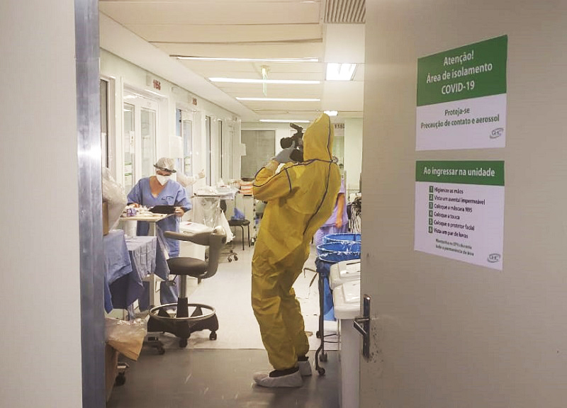 A equipe composta pelo jornalista brasileiro Paulo Trevisan e pelo fotógrafo italiano Tommaso Protti, usaram na noite do último sábado, 13 de março, paramentação especial chinesa fabricada em Hong-Kong para entrar na UTI Covid-19 do Hospital Conceição (HNSC), conforme orientação da empresa jornalística.