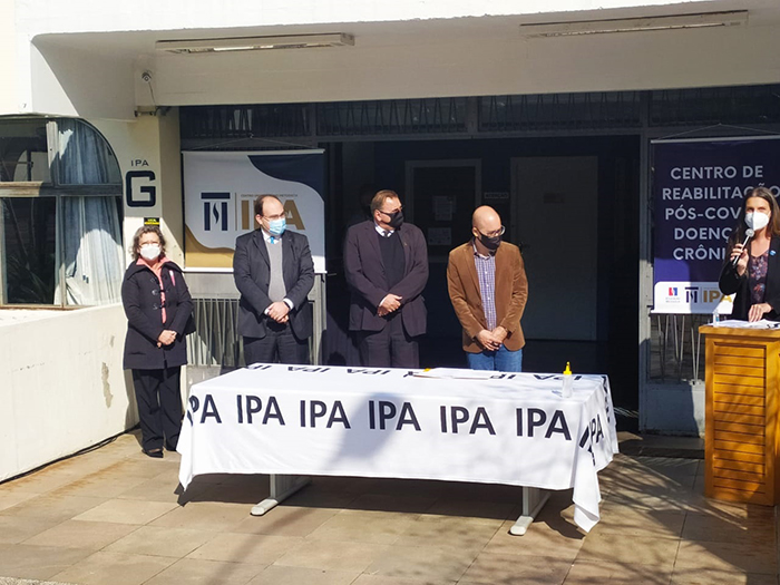 A convite do reitor do IPA, Marcos Silva, o diretor-presidente do Grupo Hospitalar Conceição, Cláudio Oliveira, participou na tarde desta segunda-feira, 17 de maio, da inauguração do Centro de Reabilitação Pós-Covid. A unidade, que funcionará na Clínica Integrada do IPA, localizada no prédio G, terá atendimento de fisioterapia, nutrição e enfermagem, totalmente gratuito para a comunidade.