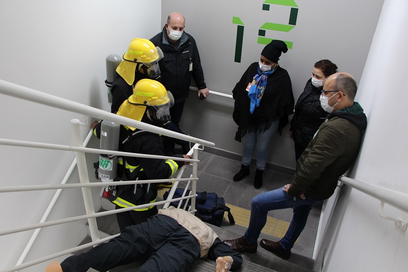 Foram retomados os treinamentos de segurança para brigadistas da Brigada de Incêndio do Hospital Conceição na manhã desta quarta-feira, 21 de julho, no Auditório Jahyr Boeira de Almeida. A equipe de primeiros socorros recebeu o primeiro treinamento nas dependências do Centro Administrativo do GHC desde a pausa das atividades, que foram suspensas em fevereiro deste ano, devido ao agravamento da pandemia de Covid-19.