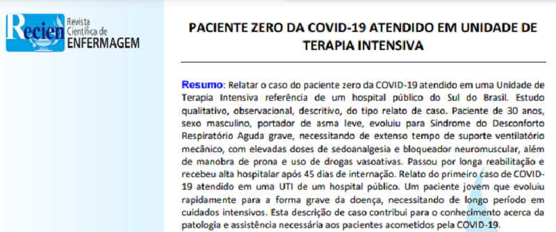 Foi publicado na Revista Científica de Enfermagem (Recien) o artigo científico intitulado "Paciente Zero da COVID-19 atendido em unidade de terapia intensiva". A publicação, em forma de relato de caso, foi desenvolvida por profissionais da Gerência de Ensino e Pesquisa, preceptores e residentes da Residência Multiprofissional do Grupo Hospitalar Conceição, Sofia Louise Santin Barilli, Natasha da Silva Indruczaki, Isadora Helena Greve, Aline Branco, Luís Joeci Jacques de Macedo Júnior e Fabiana Henriques Maciel.