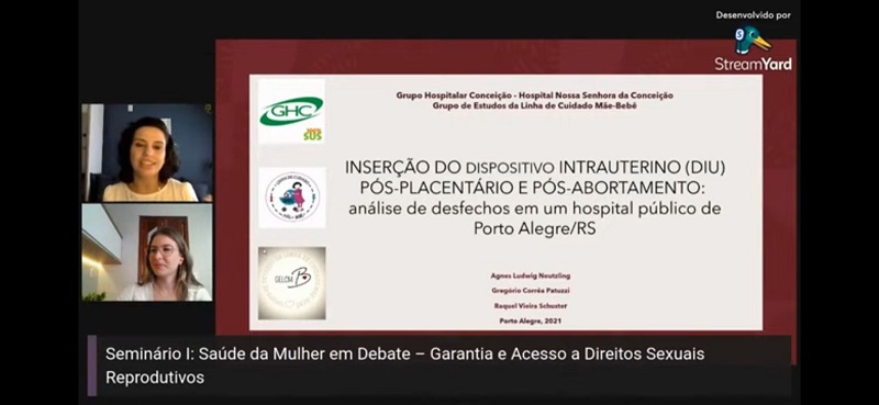 As enfermeiras representaram o Grupo de Estudos da Linha de Cuidado Mãe-Bebê (GELcmb) e a Linha de Cuidado Mãe-Bebê (LCMB), onde abordaram a experiência do serviço nesse cuidado e apresentaram dados parciais da pesquisa intitulada "Inserção do Dispositivo Intrauterino (DIU) pós-placentário e pós-abortamento: análise de desfechos em um hospital público de Porto Alegre".