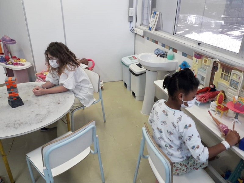 A reabertura da sala da Recreação Terapêutica obedece à orientação do Serviço de Controle de Infecção Hospitalar do HCC. Os atendimentos são realizados para no máximo três pacientes por vez, provenientes da mesma enfermaria, com utilização de máscaras e distanciamento mínimo de 1,5 metro. O ambiente é higienizado após cada atendimento, bem como os materiais utilizados.