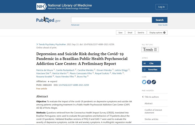 and Psychotherapy avaliando o impacto da pandemia na saúde mental dos usuários atendidos no serviço. O artigo intitulado "Depression and Suicide Risk during the Covid-19 Pandemic in a Brazilian Public Health Psychosocial Addiction Care Center: A Preliminary Report" foi publicado pela residente de Psiquiatria do GHC Patrícia Moura, em colaboração com a equipe do CAPS AD GHC, incluindo residentes Camila Rockenback, Caroline Mendes, Plauto Camozzato Filho e Raquel Scafuto e equipe multiprofissional Giovani Mendes, Letícia Ghiggi, Marciane Diel, Patrícia Martini, Rita Mello, Rossana Kovalski, Vauto Mendes Filho e Bruno Paz Mosqueiro.