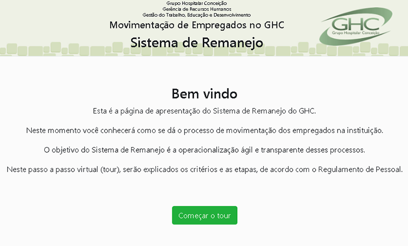 O Sistema de Remanejo é uma ferramenta de Gestão de Pessoas e de valorização do empregado que tem por finalidade gerenciar as trocas de setores e os turnos de trabalho, respeitando os cargos que ocupam no GHC, as demandas institucionais, determinações legais, organização dos serviços e necessidades de desenvolvimento institucional e individual.