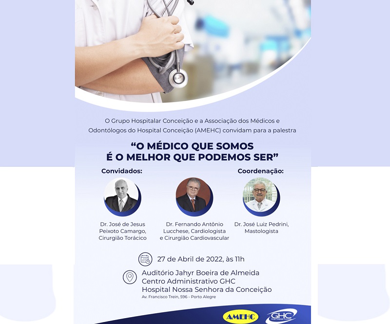 Na próxima quarta-feira, 27 de abril, às 11h, o Grupo Hospitalar Conceição (GHC) e a Associação dos Médicos e Odontólogos do Hospital Conceição (Amehc) promovem a palestra "O Médico que somos é o melhor que podemos ser", no Auditório Jahyr Boeira de Almeida, no Centro Administrativo GHC.