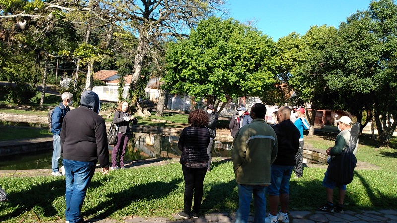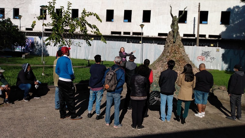 A primeira parada foi na estátua da Índia Obirici, onde vários participantes expressaram surpresa, por já terem passado por perto, sem nunca reparar no monumento. Ou seja, foi possível dar um outro olhar para o espaço cotidiano, com estímulos, muitas vezes, despercebidos e histórias desconhecidas.