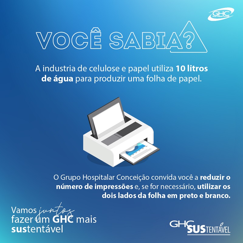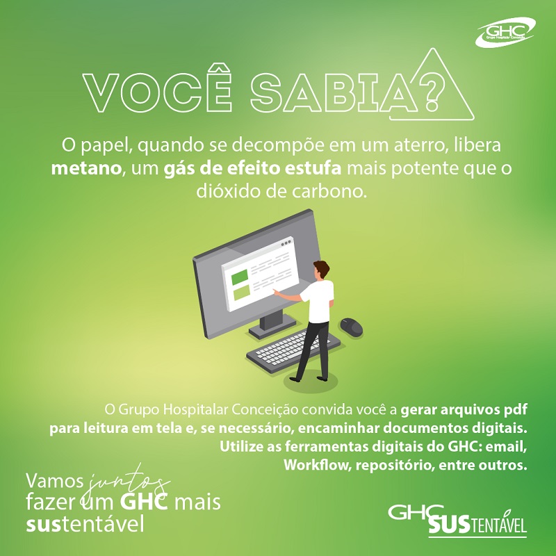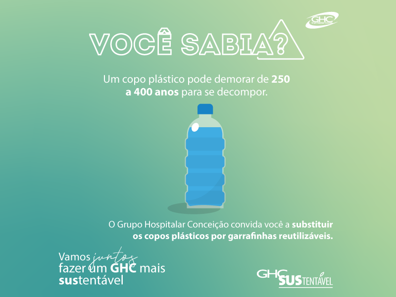 O Grupo Hospitalar Conceição lançou nesta quinta-feira, 7 de julho, uma campanha para conscientização dos colaboradores em prol da sustentabilidade, um dos valores do GHC. Por meio das redes sociais e emails institucionais, serão divulgadas semanalmente informações para o incentivo de ações que visem à redução no consumo de papel e de copos plásticos no Grupo. A campanha chama a atenção para o problema do consumo excessivo desses itens para o meio ambiente e aponta alternativas para minimizá-lo com medidas simples, como fazer uso das ferramentas digitais e substituir copos plásticos por canecas ou garrafinhas reutilizáveis.