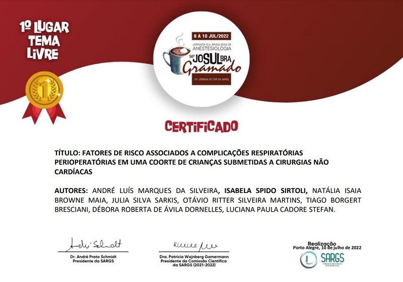 No último final de semana, 08 a 10 de julho, a anestesiologista do Hospital Criança Conceição, Isabela Spido Sirtoli, juntamente com outros profissionais do Hospital de Clínicas e acadêmicas de medicina, recebeu o primeiro lugar do prêmio de melhor trabalho da 56ª Jornada Sul Brasileira de Anestesiologia, pelo projeto intitulado "Fatores de risco associados a complicações respiratórias perioperatórias em uma coorte de crianças submetidas a cirurgias não cardíacas".