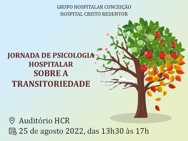 No próximo dia 25 de agosto, a equipe de Psicologia do Hospital Cristo Redentor (HCR) promove a "Jornada de Psicologia Hospitalar sobre a Transitoriedade", no Auditório do HCR, a partir da 13h30min até as 17h.