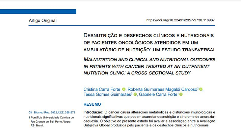 Na última sexta-feira, 6 de janeiro, a revista Clinical and Biomedical Research, do Hospital de Clínicas de Porto Alegre, publicou o estudo “Desnutrição e desfechos clínicos e nutricionais de pacientes oncológicos atendidos em um ambulatório de nutrição: um estudo transversal”, de autoria da nutricionista do Grupo Hospitalar Conceição (GHC) Tessa Guimarães, em parceria com duas profissionais que foram residentes na instituição Roberta Cardoso e Cristina Carra Forte, e com a nutricionista da Pontifícia Universidade Católica do Rio Grande do Sul (PUCRS) Gabriele Carra Forte.