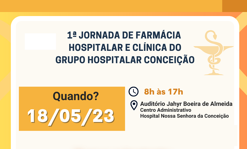 Estão abertas as inscrições para a “1ª Jornada de Farmácia Hospitalar e Clínica do Grupo Hospitalar Conceição”. O evento, que será realizado no dia 18 de maio, no Auditório Jahyr Boeira de Almeida, tem o objetivo de compartilhar ações na área desenvolvidas nos hospitais do Grupo e promover uma discussão e integração dos profissionais farmacêuticos em diversos temas que permeiam a segurança do paciente.