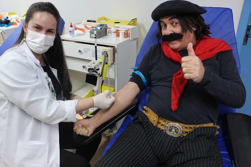 As 11h, o humorista Jair Kobe, com seu personagem Guri de Uruguaiana, visitou o Banco de Sangue, tirou foto com a equipe e com os doadores que estavam aguardando, além de fazer vídeos para as redes sociais incentivando o público a doar e participar da campanha.