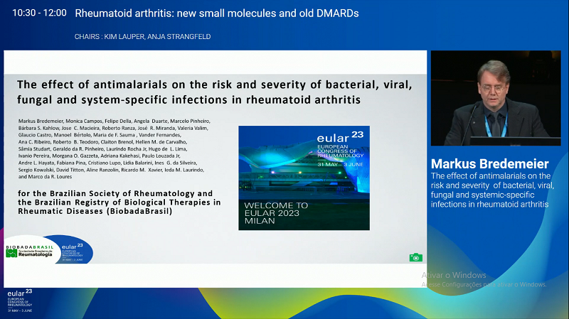 O médico reumatologista Markus Bredemeier, do Serviço de Reumatologia do Grupo Hospitalar Conceição, apresentou no último 2 de junho, durante o Congresso EULAR 2023, o estudo intitulado "O efeito dos antimaláricos sobre o risco e gravidade de infecções bacterianas, virais, fúngicas e infecções órgão-específicas na artrite e artrite reumatóide". A apresentação do trabalho científico em plenário contou com o apoio da Comissão de Residência Médica e Diretoria do GHC.