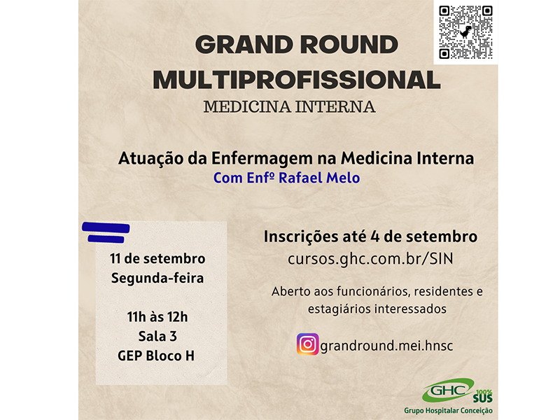 A Medicina Interna do Hospital Conceição promove no dia 11 de setembro, o Grand Round Multiprofissional, com a temática "Atuação da Enfermagem na Medicina Interna", apresentada pelo enfermeiro Rafael Melo.