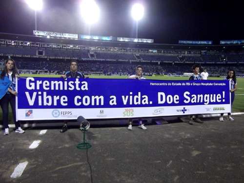 Uma faixa de seis metros de largura chamou a atenção dos torcedores presentes no estádio Olímpico Monumental no sábado, 11 de fevereiro. Graças à parceria entre o Hemocentro do Estado do Rio Grande do Sul e o Grupo Hospitalar Conceição (GHC), o material com a mensagem “Vibre com a vida. Doe sangue!” será exibido em todos os jogos da dupla Grenal, no campeonato gaúcho. A primeira exibição foi no Grenal do dia 5 de fevereiro. O objetivo é sensibilizar os torcedores para a importância de doar sangue.