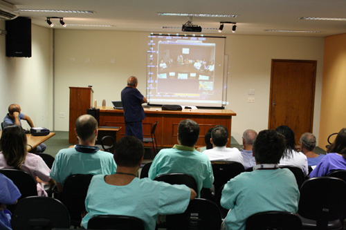 Para tratar sobre o atendimento às vítimas do incêndio em Santa Maria e compartilhar experiências sobre esse tipo de assistência, o Hospital Cristo Redentor promoveu nesta quinta-feira, 31 de janeiro, no anfiteatro, uma videoconferência com o Ryder Trauma Center da Universidade de Miami. Conforme o médico cirurgião do trauma do HCR Charly Genro Camargo, a instituição norte-americana, com um centro de atendimento a catástrofes, está solidária com os profissionais no atendimento aos feridos. Na videoconferência, o chefe da cirurgia do Ryder Trauma Center, Maurício Lynn, que fala português, conversou com o corpo clínico do Cristo Redentor a respeito de tratamentos de queimadura e tratamento inalatório. Lynn lembrou que em “qualquer lugar do mundo é difícil mobilizar todo o esquema necessário para o tratamento de centenas de pessoas atingidas pelo mesmo trauma, no mesmo momento”, e que o que conseguimos no Estado “foi uma grande realização”.