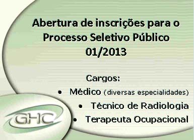 Foram abertas nesta sexta-feira, 12 de julho, as inscrições para novo Processo Seletivo Público do Grupo Hospitalar Conceição. A seleção é destinada ao preenchimento de vagas existentes e à formação de cadastro reserva para os cargos de técnico de radiologia, terapeuta ocupacional e médico (anestesiologia, cirurgia torácica, clínica médica, emergencista, mamografia, medicina intensiva, pediatra, radiologia e diagnóstico por imagem). As inscrições podem ser feitas até o dia 11 de agosto, exclusivamente pelo site www.fundacaolasalle.org.br/concursos, onde também estará publicado o Edital de Abertura 01/2013.
