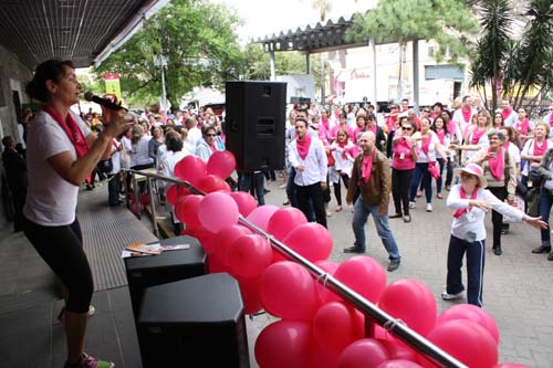 Nesta quinta-feira, 10 de outubro, o Hospital Conceição (HNSC) realizou a “Caminhada pela Vida”, reunindo dezenas de pessoas em defesa da luta contra o câncer. A ação que marca o Outubro Rosa faz um alerta sobre a importância da detecção precoce da doença, promovida pelo Grupo Voluntárias da Mama e dos serviços de Mastologia e de Onco-hematologia, da Comissão de Controle de Tabagismo e da Administração do HNSC. Em frente à instituição, os participantes praticaram exercícios de aquecimento com a professora de ginástica Silvana Souza, antes de começar o percurso que teve como ponto final, o Shopping Bourbon Country.